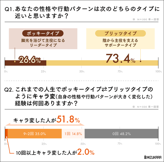認知科学に基づくコーチングを法人・個人に提供する株式会社ミズカラ(本社:東京都千代田区、代表取締役 山宮健太朗)は、2025年10月21日(火)に25歳~59歳の既婚有職男女500名を対象とした「ポッキー&プリッツと日本人のキャラ観」に関する意識・実態調査を行いました。