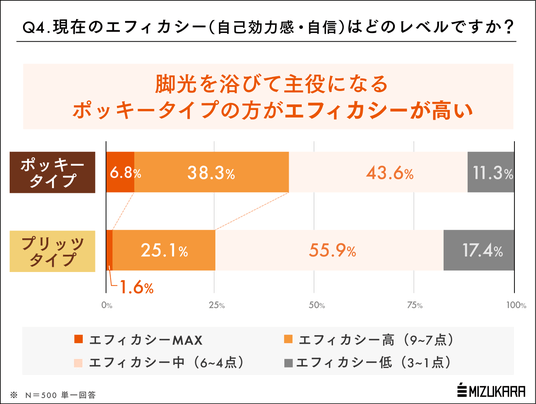 最後にポッキータイプ/プリッツタイプそれぞれのキャラ別にエフィカシー(自己効力感・自信)の度合いを分析してみました。結果は予想通りですが、脚光を浴びて主役になるポッキータイプの人はエフィカシーが高い傾向が確認できました。他者という鏡を通して自己は変化しますが、脚光を浴びたり注目されることでその変化にブーストがかかる可能性もありそうです。ある程度自信がついてきたら、思い切って何かに立候補したり挑戦してみると一気に「キャラ変」できるかもしれません。