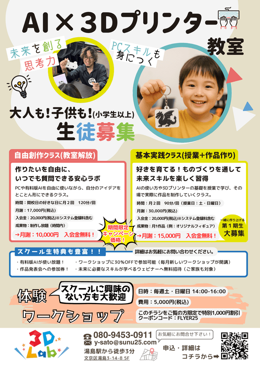 3DLabは、AIと3Dプリンターの融合を体験できるスクールとワークショップを展開し、初心者から社会人まで“AIでものづくりを学べる場”として注目を集めています。