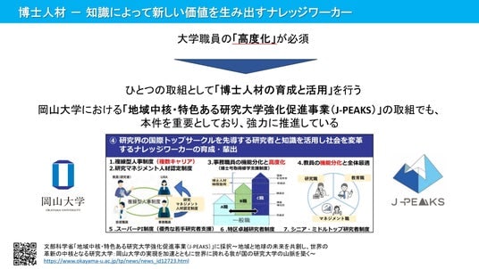 - 岡山大学 文部科学省「地域中核・特色ある研究大学強化促進事業(J-PEAKS)」に採択~地域と地球の未来を共創し、世界の革新の中核となる研究大学:岡山大学の実現を加速とともに世界に誇れる我が国の研究大学の山脈を築く~