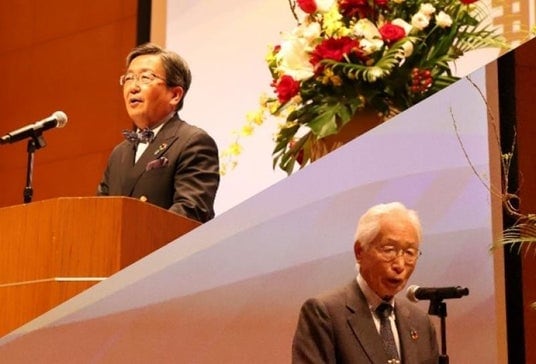 (左上) 那須学長による開会あいさつ。 (右下)岡山大学Alumni(全学同窓会)小長会長による祝辞