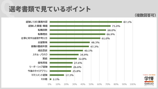 (2)選考書類で見ているポイントは「経験してきた業務内容」「経験した業種・職種」の順で多く、経験重視