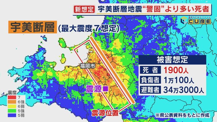 専門家の意見を基に、宇美断層南部の春日市付近を震源とした被害を算出。調査の結果、想定する死者数は、警固断層帯より多い1900人(※関連死800人を加えると2700人に)、避難者は34万人を超えるとの予測だった。