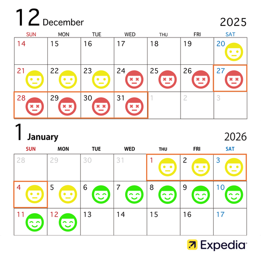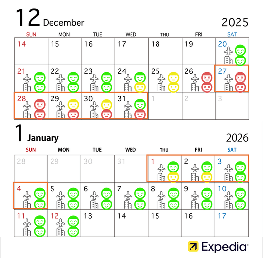 A6. エクスペディアの昨年末の1泊あたりの平均宿泊費と平均航空券代のデータ[3]をもとに予測すると、年明け1月6日(火)以降の出発が比較的費用を抑えられます。クリスマスから年末にかけては料金が高くなる傾向があるため、年明けの出発がお得です。
