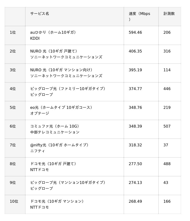1位となったのはKDDIのauひかりホーム10Gサービス。次にNURO光、ビッグローブ光と続く結果となりました。