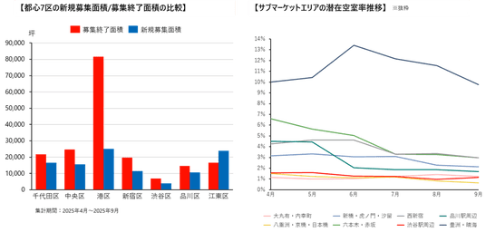 一方、港区は新規募集面積に対して募集終了面積が約3.2倍となり、都心7区の中で最も空室消化が進んだ(4月:5.00%→9月:2.74%、-2.26pt)。