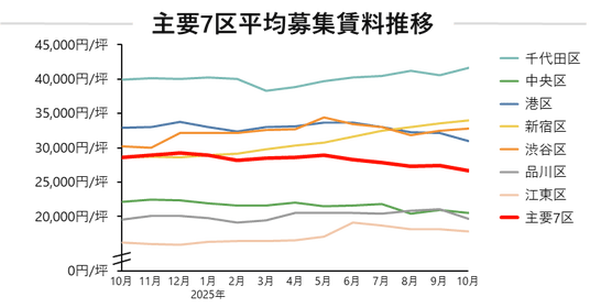 主要7区の平均募集賃料は26,642円/坪で前月比-751円/坪。
