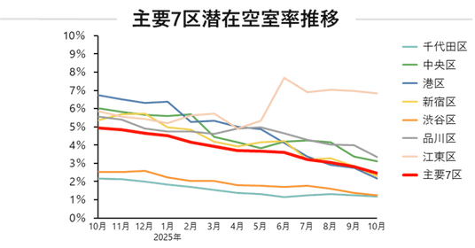 2025年度上半期は、募集終了面積が新規募集面積を上回り空室消化が進んだことで、都心7区の潜在空室率は低下した。都心7区の中では、豊洲・晴海エリアで大型の新築ビルが供給されたことなどが影響し、江東区のみ潜在空室率が上昇(4月:4.90%→9月:6.96%、+2.06pt)した。