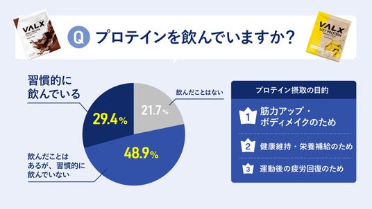 また、プロテインの飲用経験者は全体の78%と高い関心が見られた一方で「習慣的に飲んでいる」と回答したのは29%にとどまりました。興味を持ちながらも継続できていない層が多く、目的別の情報発信や利用シーンの提案など、より身近に取り入れられる環境づくりが重要であることが示唆されています。
