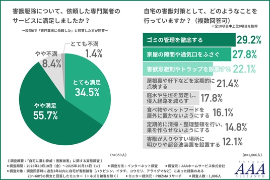 駆除ザウルス(運営:AAAアライアンス、所在地:東京都世田谷区、代表取締役:西岡 徹也)は、過去3年以内に自宅が害獣被害(ハクビシン、イタチ、コウモリ、アライグマなど)にあった経験のある20~60代の男女を対象に、「自宅に潜む脅威!害獣被害」に関する実態調査を行いました。