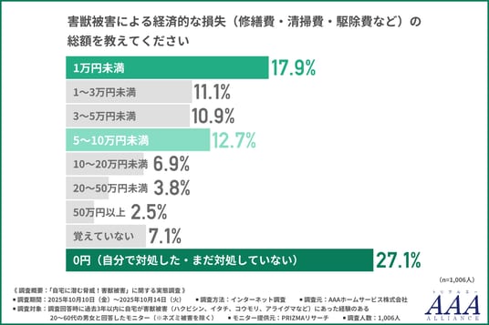 「害獣被害による経済的な損失(修繕費・清掃費・駆除費など)の総額」について尋ねたところ、以下のような回答結果になりました。