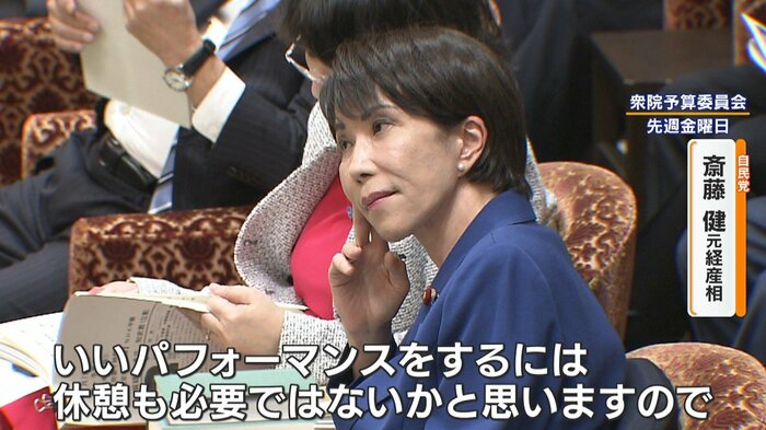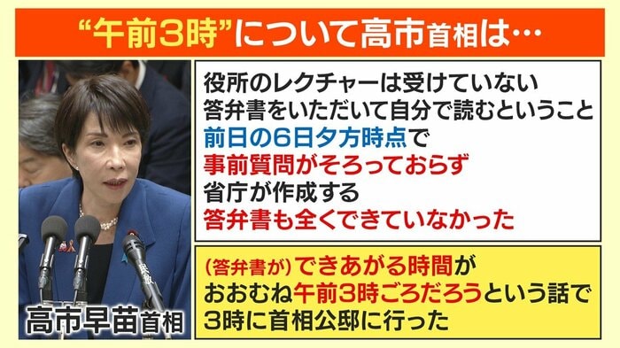 野党は、「総理のレクは大変多くの方に影響を与える」と指摘。高市氏は、予算委員会で使用する答弁書が出来上がるのが、午前3時ごろになると言われたため致し方なかったとしながらも、「私がどんどんペン入れして直しちゃうものですから、それを手伝ってくれた秘書官、宿舎から公邸までついてきてくれたSPさんとドライバーの方にご迷惑をかけたと思っております」と回答しました。