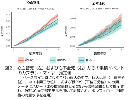 ・ さらに研究グループは、心不全発症や死亡リスクを予測する「多遺伝子リスクスコア(PRS)(注4)」を独自に開発しました。日本人集団に最適化されたこのスコアは高い精度を示し、高リスク者の早期発見や死亡リスクの層別化が可能となりました(図2)。PRSが高い人は、若くして心不全を発症するリスクが高く、さらに診断時にはまだ心不全でない人でも、将来的な死亡リスクが高いことが分かりました。
