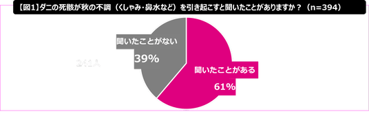 全国の20代~50代の男女428名を対象に「ダニの死骸が秋の不調(くしゃみ・鼻水など)を引き起こすという話を聞いたことがあるか」と質問したところ、 61%が「ある」と回答し、回答者の半数以上が「秋の不調(くしゃみ・鼻水など)はダニが原因のひとつ」と認識していることがわかりました。【図1】