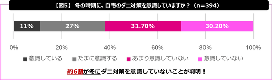 さらに、62.9%が「冬の時期に自宅のダニ対策を意識していない」と答えており、多くの人が“冬は安心”という誤ったイメージを持っていることが明らかになりました。【図5】