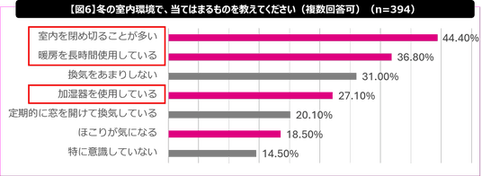 しかし、冬の室内環境について尋ねたところ、「室内を閉め切る」(42.0%)、「暖房を長時間使用する」(35.0%)、「加湿器を使用する」(27.9%)と、上位に挙がったのはいずれもダニが繁殖しやすい環境条件につながる行動でした。乾燥によって一時的に活動が落ち着くように見えても、加湿や暖房によってダニにとって快適な温湿度が保たれる冬の室内では、ダニによる被害が続く可能性があります。【図6】