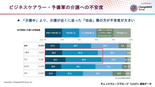 特に「切迫」層においては、介護が迫っていると感じてはいても具体的な準備・情報収集にまでは至っておらず、漠然とした不安や、仕事への影響、キャリアの中断に対する懸念が大きいと考えられます。