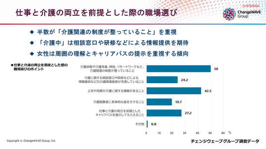 ・職場選びは「介護制度の整備」(50%)が最重要。次いで「上司・同僚の理解」(42.5%)