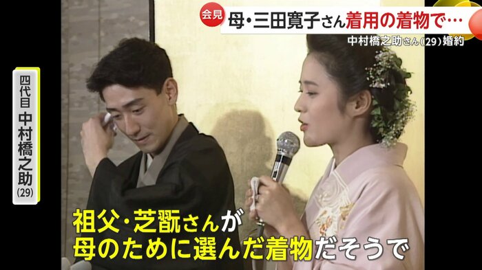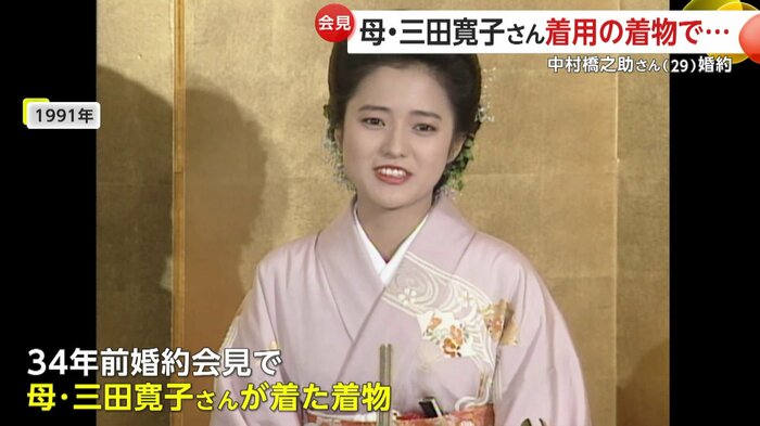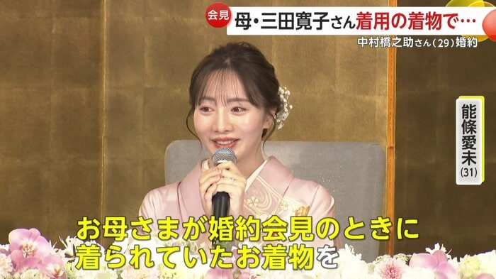 能條さんは、34年前の橋之助さんの母・三田寛子さんが着用した着物で会見に臨んだ。