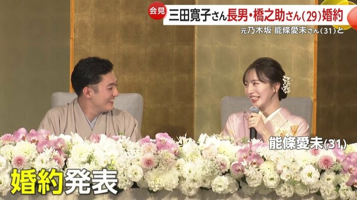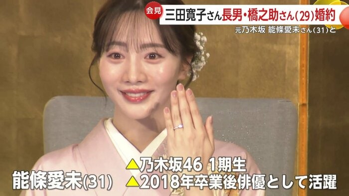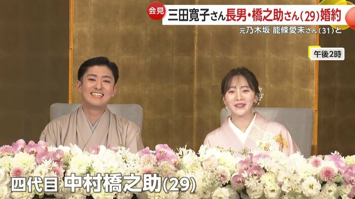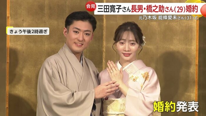 中村芝翫さん(60)と三田寛子さん(59)の長男・中村橋之助さん(29)が婚約したことを発表した。お相手は、元乃木坂46の俳優・能條愛未さん(31)。