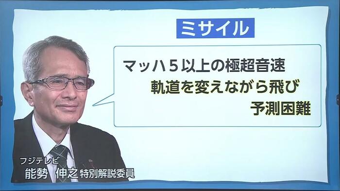 防衛問題を専門に取材しているフジテレビ特別解説委員、能勢伸之氏は、「厳しい安全保障環境」について、北朝鮮、中国、ロシアが例えば極超音速ミサイルの開発・配備を進めて軍事力を強めている、と説明。