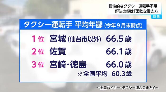 さらに、運転手の平均年齢も高い。全国平均は60.3歳だが、宮崎県は66.0歳と高齢化が著しい。1位の宮城県(仙台市以外)66.5歳、2位の佐賀県の66.1歳に次いで、全国でも3番目に高い66.0歳となっている。