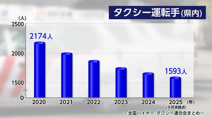 宮崎県内はさらに深刻な状況だ。全国ハイヤー・タクシー連合会の調査によると、県内のタクシー運転手は2020年には2174人いたが、2025年9月末時点では1593人と、5年間で7割ほどに減少している。