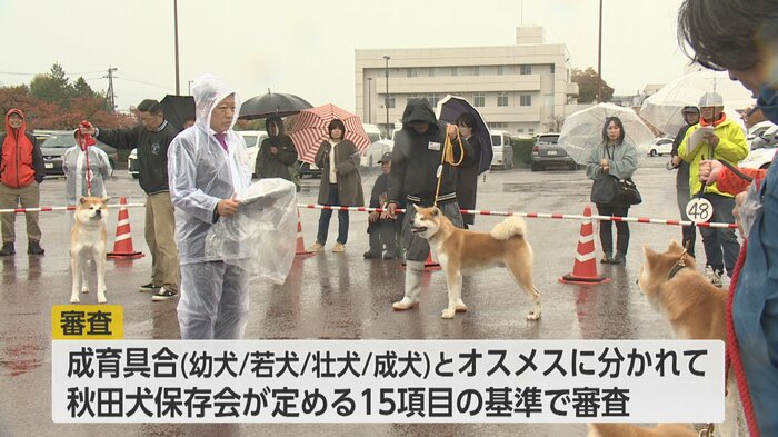 展覧会では、秋田犬保存会が定める15項目の基準に従って審査が行われる。参加者の一人は次のように説明する。「顔の美しさ、体つき、毛の色、毛並みなどが見られます。性格は人がいてもオドオドしない、人間がハンドリングしているときに動かずに堂々と立っているかが大事です」