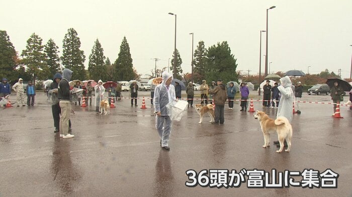 国の天然記念物に指定されている秋田犬が富山市に集結した。9日、県内外から36頭もの秋田犬が「秋田犬らしさ」を競う展覧会に参加するため、雨の降る富山市に集まった。