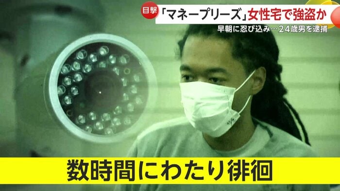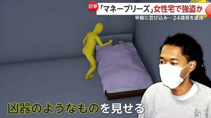 室内で女性が寝ていたところ凶器のようなものを見せつけ、語気を強め「マネープリーズ」と脅した。