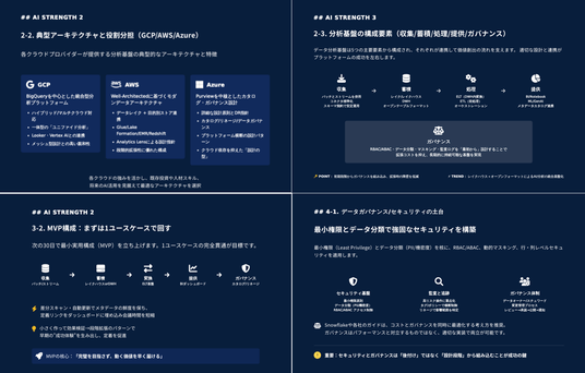 そこで本資料では、国内外のリファレンスと最新トレンドを踏まえて、最短で成果を出すロードマップ、クラウド(GCP/AWS/Azure)別の設計要点、ガバナンスとコスト最適化までを体系的に解説します。