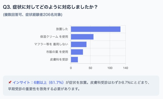 首元トラブルを経験した人のうち、何も対策をせず放置した人が61.7%を占めました。「そのうち治ると思った」(48.5%)、「対処法がわからなかった」(32.3%)といった理由が上位となっています。