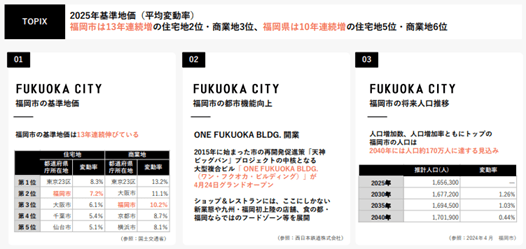 福岡市の基準地価は13年連続で上昇しており、平均変動率は住宅地で全国2位、商業地では全国3位となっています。