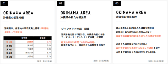 2025年7月25日に本島北部に県内初の本格テーマパーク「ジャングリア沖縄」が開業しました。経済効果は15年間で6兆8000億円と試算されており、国内外の集客が今後も見込まれ、さらなる観光客関連の投資が進み不動産価格上昇に起因すると考えられます。