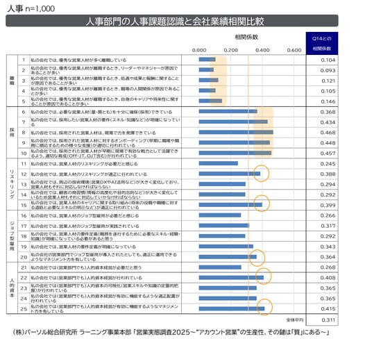 ・ 昨今の人手不足を反映して、「離職」や「採用」に関する課題認識が強く、営業(現場)と人事との間では切実感に開きがある(営業現場の方が切実に人材不足を感じている)。一方、これらの項目は業績との関連性(相関)も認められるため、「離職」を減らし、潤沢に「採用」することが事業課題に影響を与える重要な課題といえる。