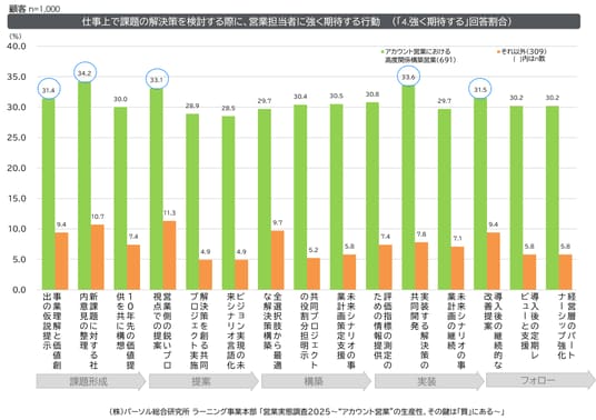 ・ 営業に期待される行動は、課題形成~提案段階では「鋭いプロ視点で解決策の提案」 のために、「価値創出の仮説提示」「多様な社内意見の整理」が重視される。