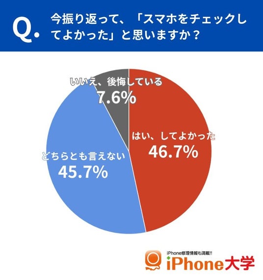 「今振り返って、スマホをチェックしてよかったと思いますか?」という質問では、「してよかった」46.7%、「どちらとも言えない」45.7%、「後悔している」7.6%という結果になりました。