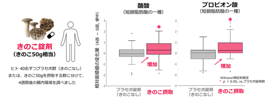 試験概要:本試験は、株式会社メタジェンとホクト株式会社の共同研究として実施しました。参加者80名を、きのこを含まないプラセボ錠剤を摂取する群と、マイタケ・ブナシメジ・エリンギから作製したきのこ錠剤を摂取する群に分け、4週間の摂取試験を行いました。その結果、4週間後にはプラセボ群に比べ、マイタケを含むきのこ錠剤群で、便中の短鎖脂肪酸の一種である酪酸およびプロピオン酸の有意な増加が認められました。