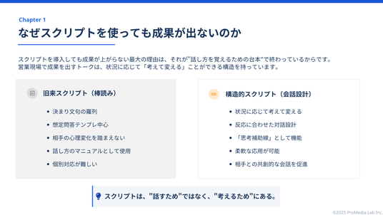 本資料では、スクリプトを“話すための台本”ではなく、成果を再現するための構造的フレームワークとして再定義。