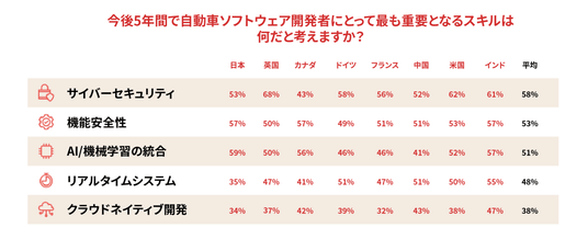 こうした中、最も困難と感じている規制の種類は、「サイバーセキュリティ」(49%)、「機能安全」(42%)、「AI/機械学習関連」(38%)で、いずれもグローバル平均を上回っています。これら3つの分野は、今後5年間で最も重要となるスキルとしても認識されており、「AI/機械学習の統合」(59%、グローバル平均51%)、「機能安全性」(57%、同53%)、「サイバーセキュリティ」(53%、同58%)との結果が示されました。特に「AI/機械学習関連」は規制分野における課題でも上位に位置付けられており、AIと機械学習は、日本のSDV開発環境において規制とスキルの両面で重視されていることがわかります。