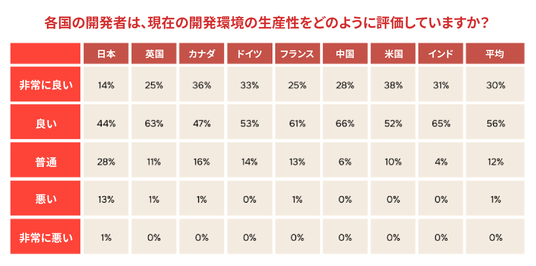 こうした課題意識は、開発環境の生産性に対する厳しい見方にも影響している可能性があります。現在の開発環境の生産性についての評価を問う質問に対し、日本の回答者が「非常に良い」と答えた割合は14%で、グローバル平均の30%を大きく下回りました。一方で「普通」(28%)、「悪い」(13%)、「非常に悪い」(1%)と答えた割合は、いずれも調査対象国のうち最も高い数字を示し、開発環境への評価がグローバルに比べて総じて低い傾向が浮かび上がりました。