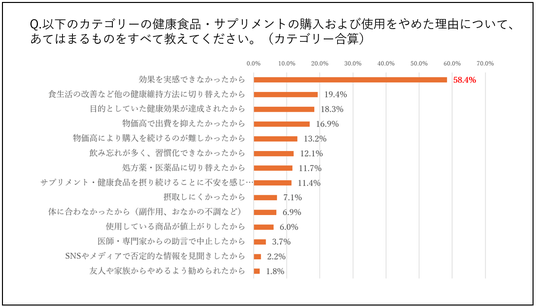 - 継続の最大の鍵は「効果実感」。購入中止理由として、いずれのカテゴリーについても1位は「効果が実感できなかった」。「物価高」を理由に離脱したカテゴリーがあると回答とした人は2割未満。