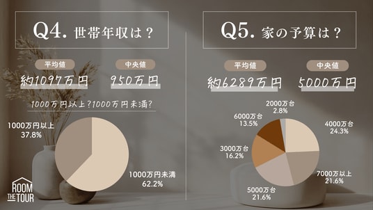 実際の回答には、「年収650万円で家の予算4,150万円(土地+建物+外構)」「年収1,200万円で予算5,000万円」「年収1,500万円で予算1億円」などリアルな声が寄せられました。