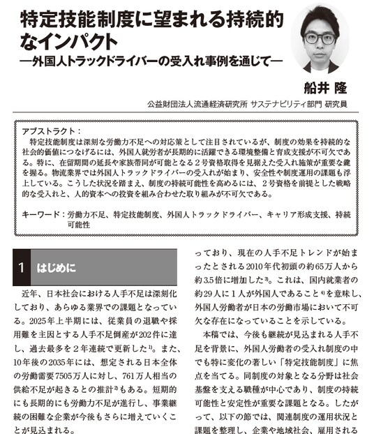 「特定技能制度に望まれる持続的なインパクト―外国人トラックドライバーの受入れ事例を通じて―」