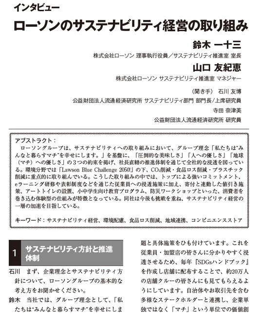 また、コンビニエンスストア大手・ローソンのサステナビリティ推進室へのインタビューを通じ、商品・店舗・地域の各領域における取り組みを紹介しています。