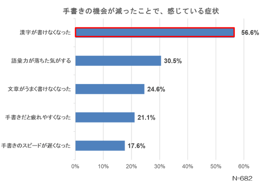 近年、スマートフォンの長時間利用による記憶力や集中力の低下を指す“スマホ認知症”が現代人の新たな課題として注目されています。今回の調査では、スマホの使いすぎが自分の生活や健康に影響していると感じる人が63.2%に上ることが判明しました。さらに、デジタル化の進展により、手書きの機会が減ったと感じる人は68.2%に達し、そのうち「漢字が書けなくなった」と回答した人は56.6%と、半数以上が"書く力の衰え"を自覚する結果となりました。