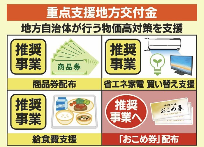 物価高対策として、地方自治体を支援する「重点支援地方交付金」があります。自治体が自由に使える地方交付金の中には、推奨事業として、商品券配布、省エネ家電買い換え支援、給食費支援などがありますが、そのうちの一つとして政府が活用を推奨していこうというのが「おこめ券」の配布です。