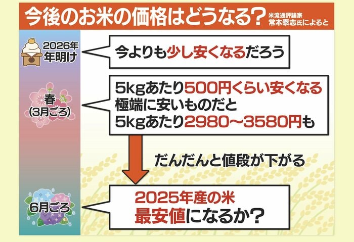 年末年始にかけては多少安いものが出てくるのかなという予想はしております。これが春頃になるともう一段階安くなる。5kgあたり2980~3580円のものもB銘柄で出てくる可能性はあるだろうと踏んでいます。