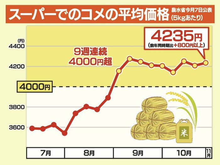 農水省によると、10月27日から11月2日にかけて全国のスーパーで販売されたコメの平均価格は、5kgあたり4235円。2週ぶりに値上がりし、5月中旬に記録した過去最高の4285円に迫る水準です。
