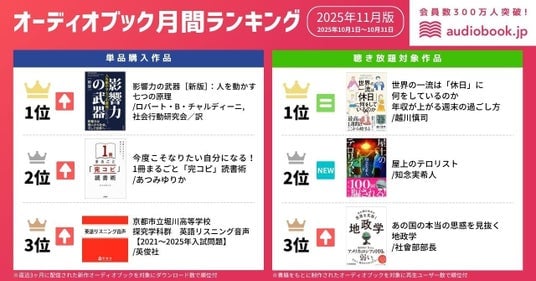 株式会社オトバンク( 本社:東京都文京区、代表取締役社長:久保田裕也、以下「オトバンク」)は、当社が運営する会員数300万人超、オーディオブック書籍ラインナップ数No.1(※1)のオーディオブック配信サービス「audiobook.jp」における、オーディオブック月間ランキング11月付(2025/10/1~10/31)を発表します。